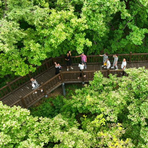 7月6日,游客在内蒙古呼伦贝尔市扎兰屯市秀水国家湿地公园游玩(无人机照片)。