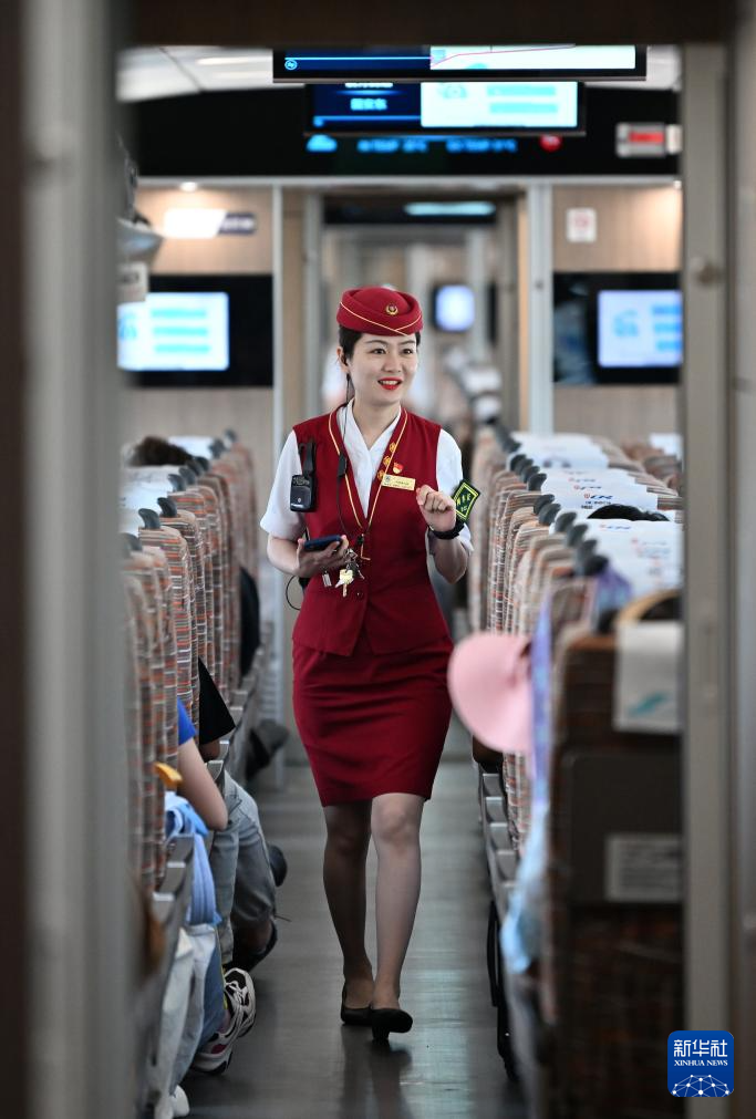 7月6日,在津兴城际G8844次列车上,天津客运段乘务人员在巡查车厢。