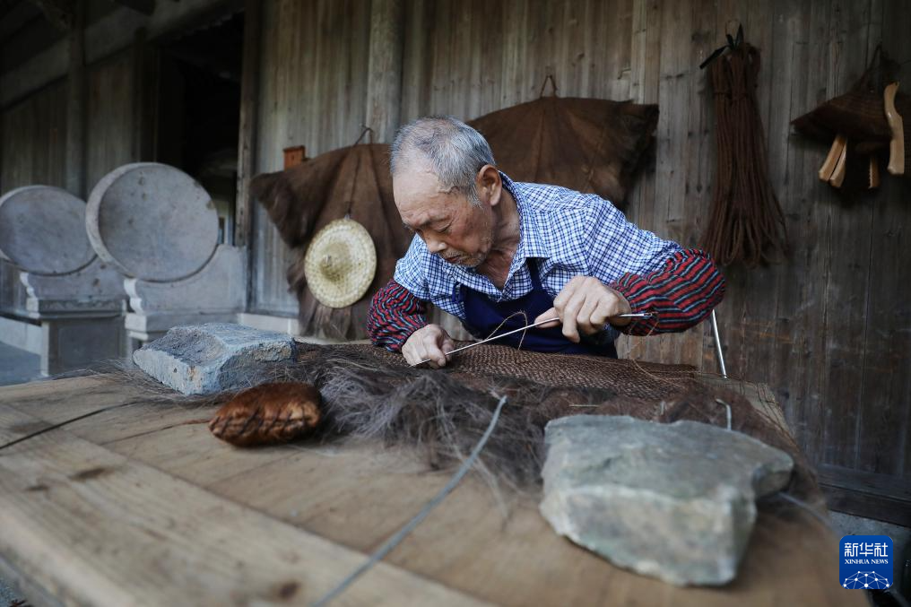 7月3日,手艺人在江西婺源篁岭村制作蓑衣。