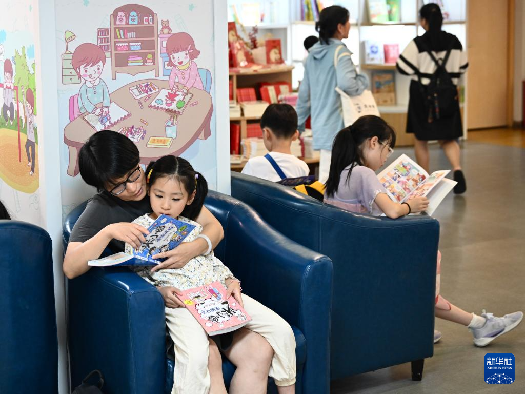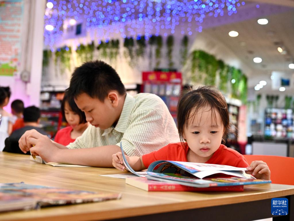 7月6日,福州新华书店鳌峰坊书城内家长陪伴孩子读书纳凉。