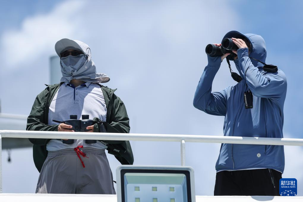 7月5日,在海南岛东部海域,考察团队成员在甲板上观测。