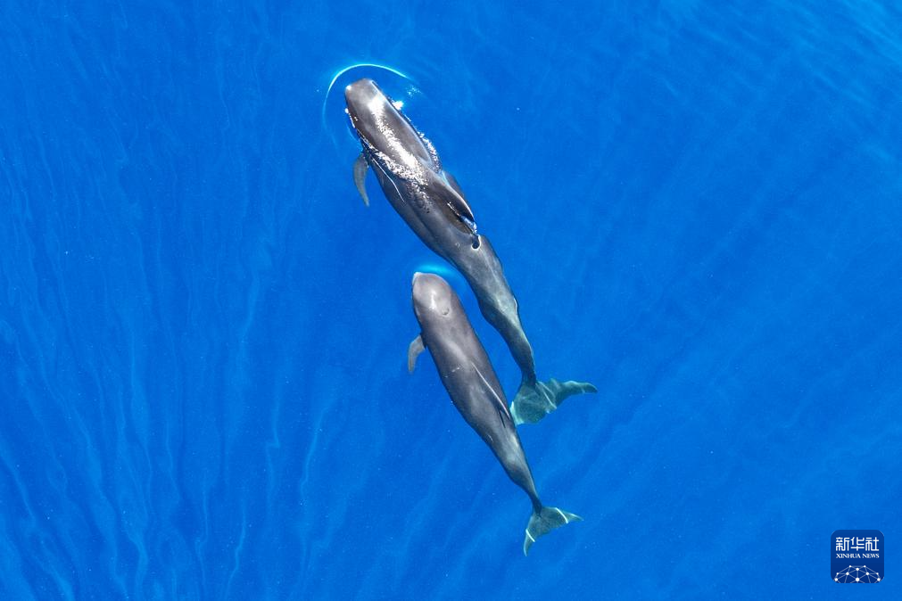 7月6日,短肢领航鲸母子对在海南岛东部海域畅游(无人机照片)。
