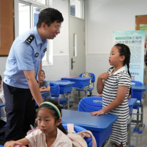 7月8日,在位于虹口区第一中心小学的北外滩街道爱心暑托班,社区民警在“开班第一课”安全教育课上与小学生互动。