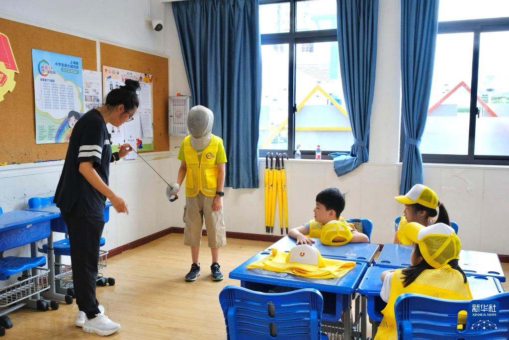 7月8日,在位于上海市敬业初级中学的老西门街道爱心暑托班,小学生们在了解体验击剑运动。