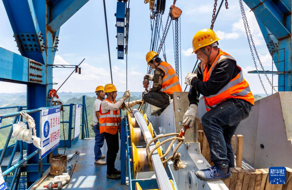 7月7日,工人在花江峡谷大桥6号主塔进行主缆索股架设施工。
