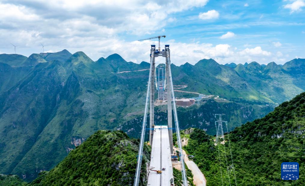7月7日拍摄的建设中的花江峡谷大桥(无人机照片)。