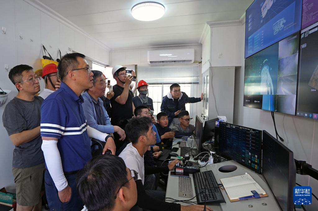 团队成员在控制中心操控深海采矿车,观察海底作业实时情况(6月22日摄)。