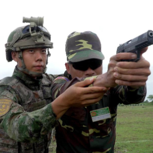 7月8日,在老挝人民军库玛丹学院训练场,中方参演官兵与老方官兵交流手枪射击方法。