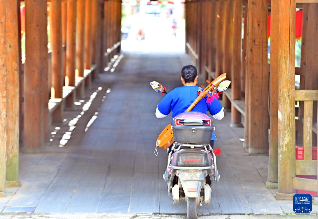 在广西柳州市三江侗族自治县林溪镇平岩村,村民背着侗族琵琶去上班(7月7日摄)。