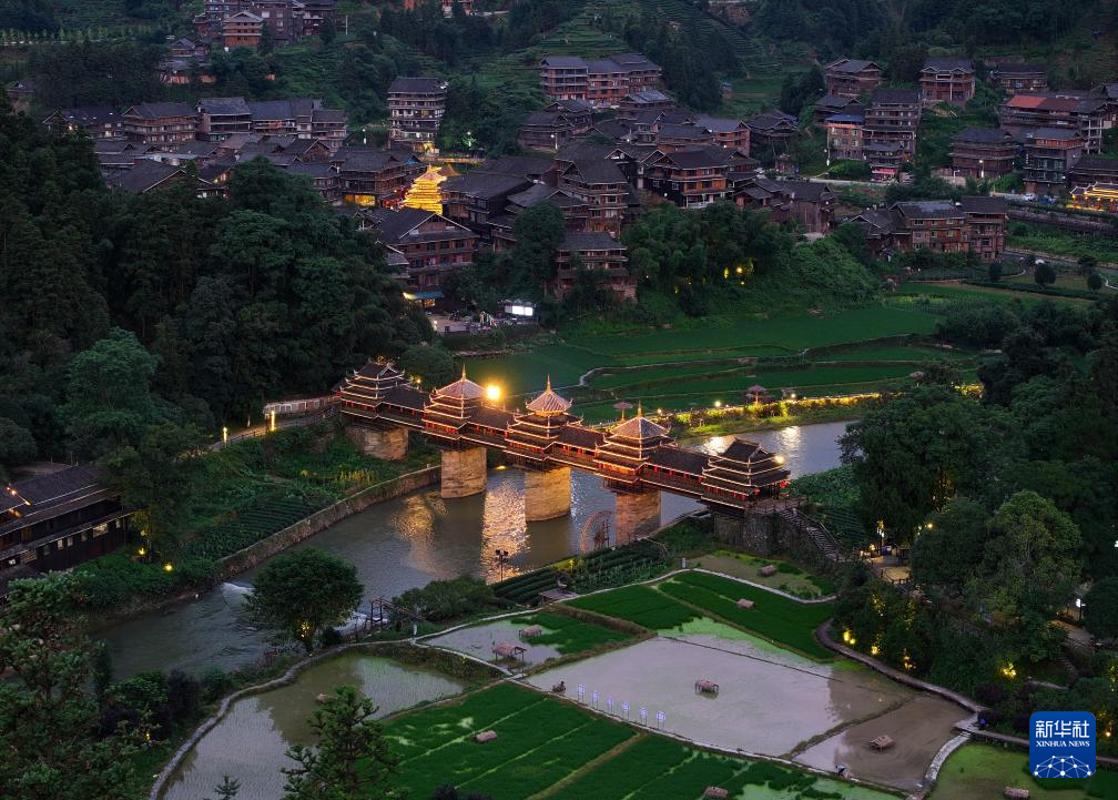 这是广西柳州市三江侗族自治县林溪镇平岩村夜色(无人机照片,7月7日摄)。