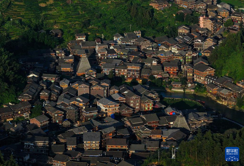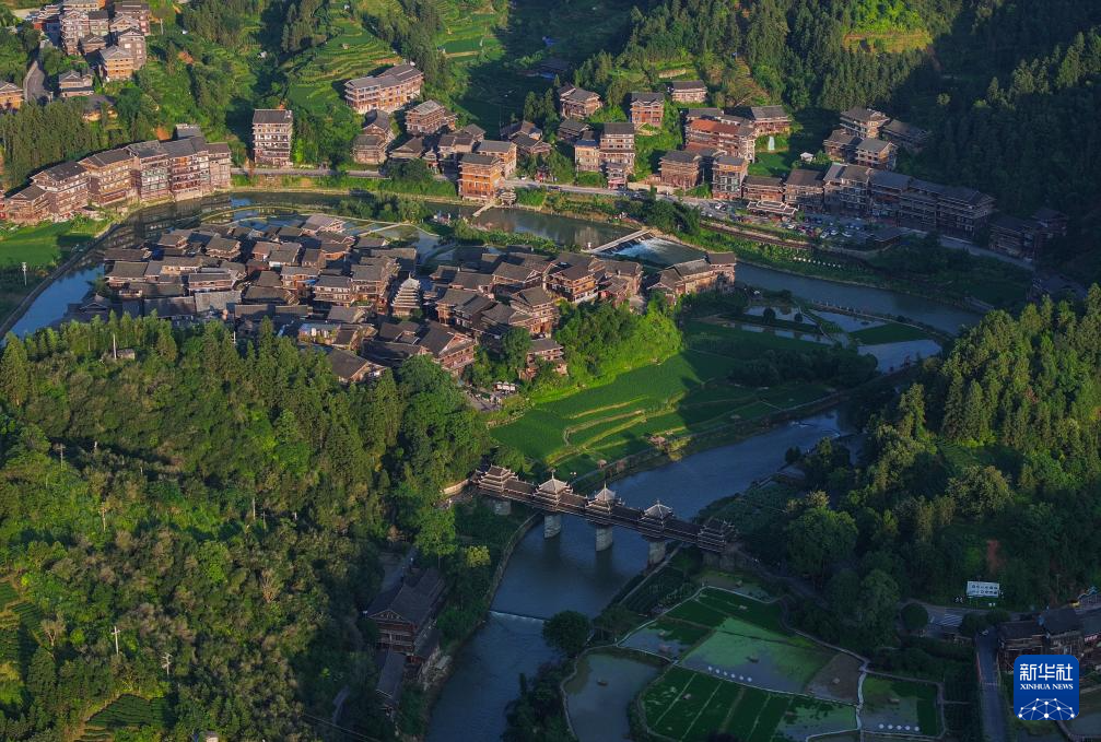 夕阳下的广西柳州市三江侗族自治县林溪镇平岩村(无人机照片,7月7日摄)。