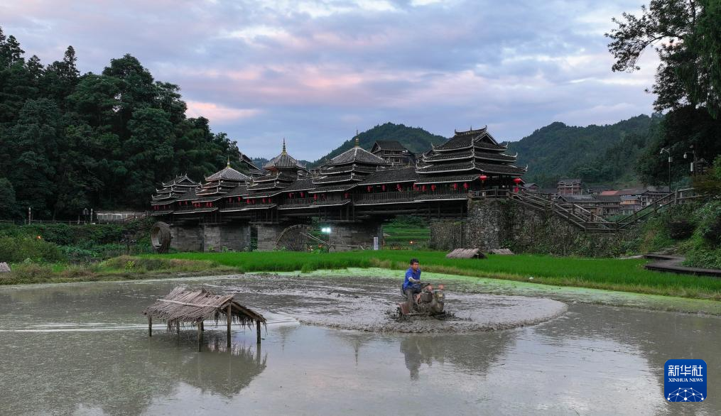 在广西柳州市三江侗族自治县林溪镇平岩村,村民在插秧前犁田(7月7日摄)。