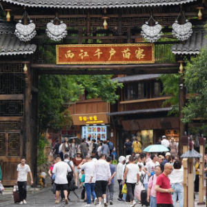 7月9日,游客在西江千户苗寨游玩。