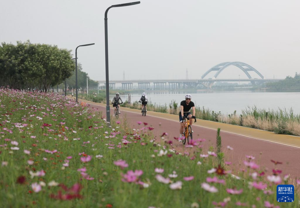 7月9日,自行车爱好者在石家庄市滹沱河南岸的环城绿道北线骑行。