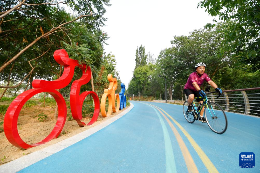 7月9日,自行车爱好者在石家庄市环城绿道东线骑行。