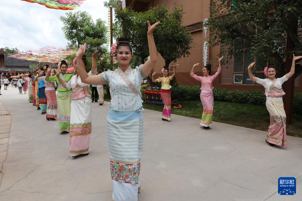 在云南省西双版纳傣族园景区内的传统傣寨曼听村,村民跳起迎宾舞(7月7日摄)。