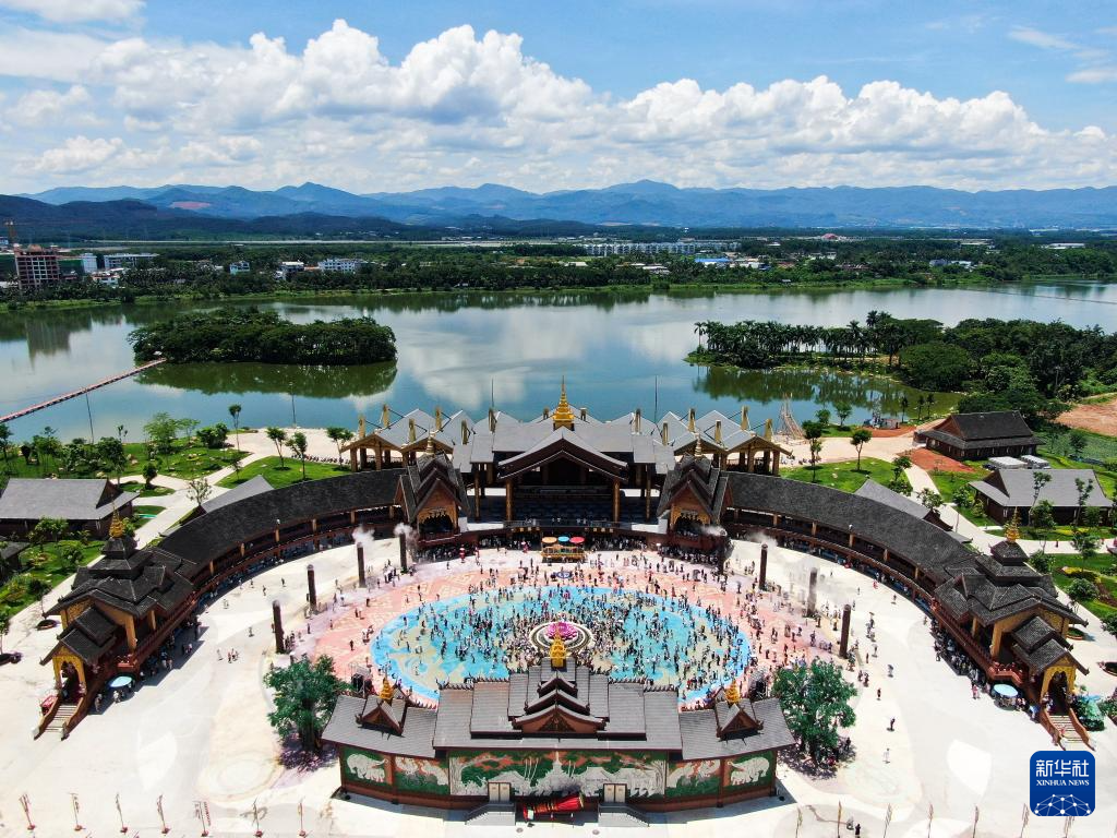 在云南省西双版纳傣族园景区内的传统傣寨曼听村,游客参加泼水狂欢活动(无人机照片,7月7日摄)。