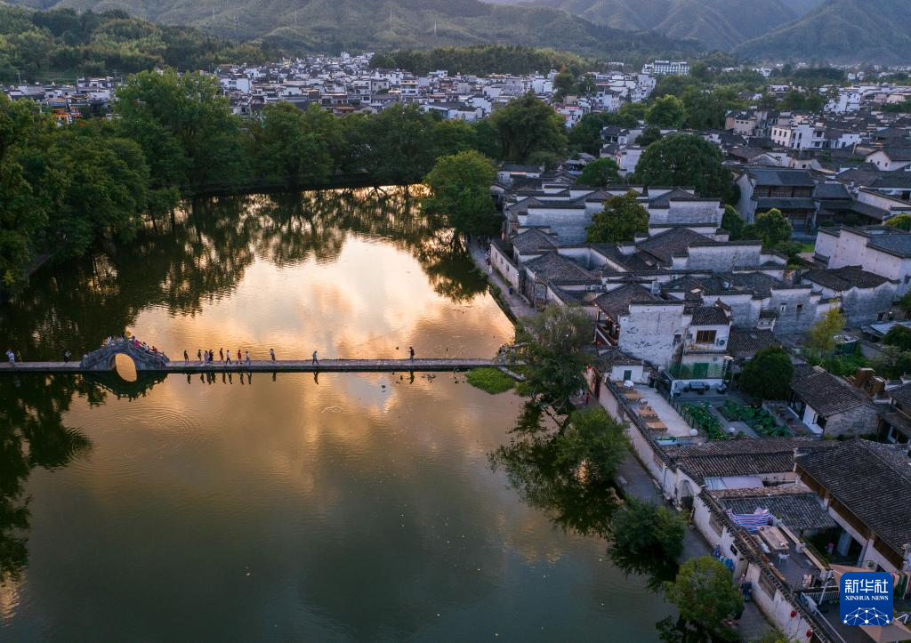 7月7日,游客在安徽省黄山市黟县宏村游玩(无人机照片)。
