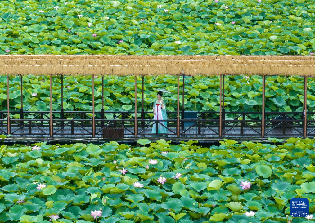7月8日,游客在江苏省兴化市千垛镇的万亩荷塘景区赏荷游玩(无人机照片)。