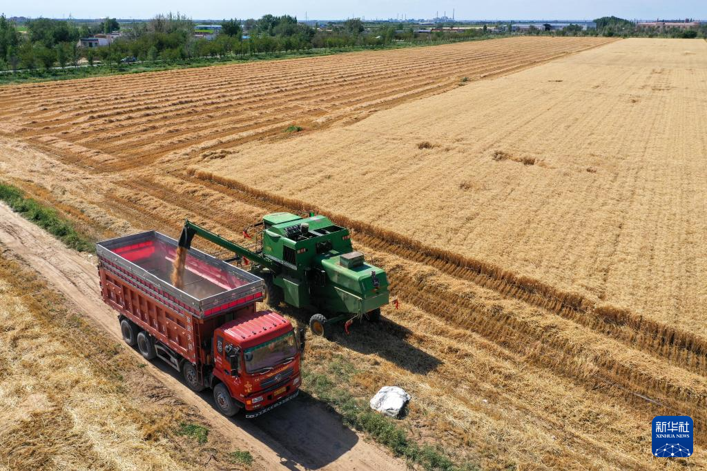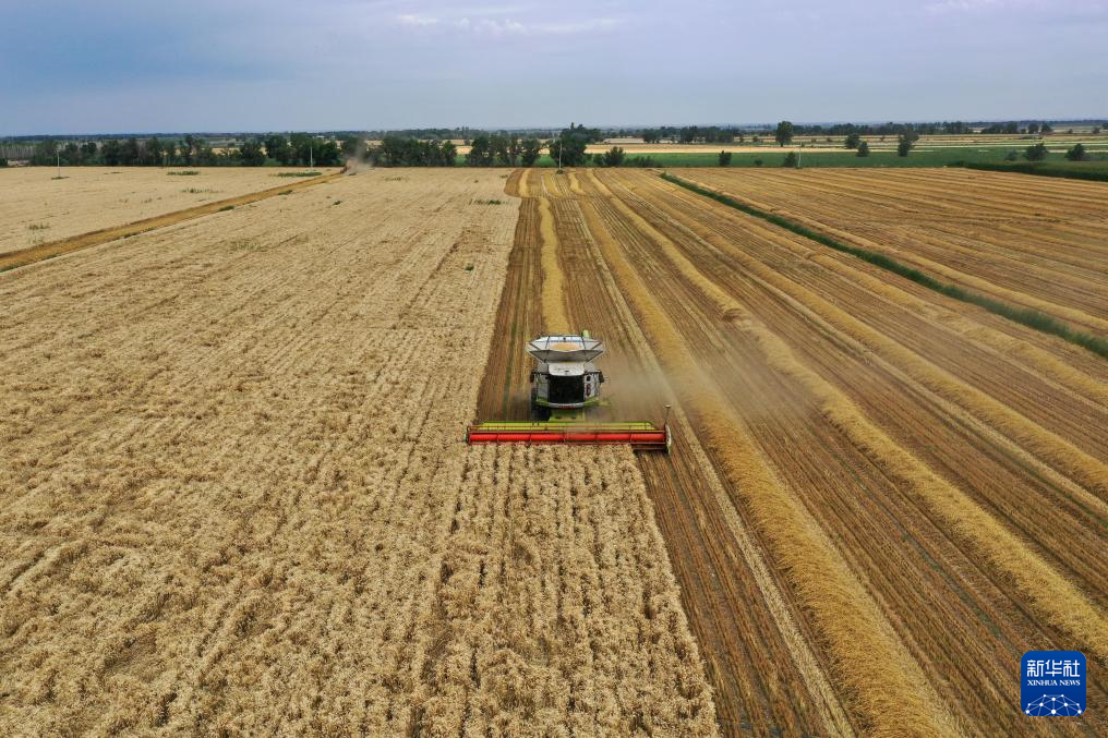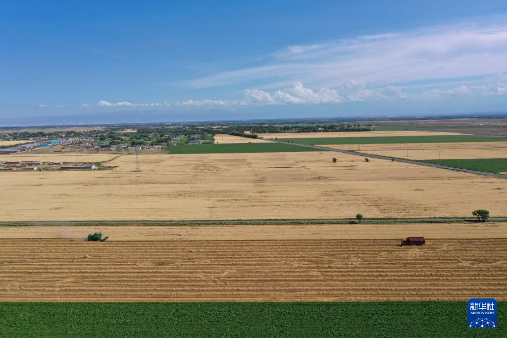 在新疆昌吉回族自治州奇台县西地镇,农户在田间收获小麦(7月9日摄,无人机照片)。
