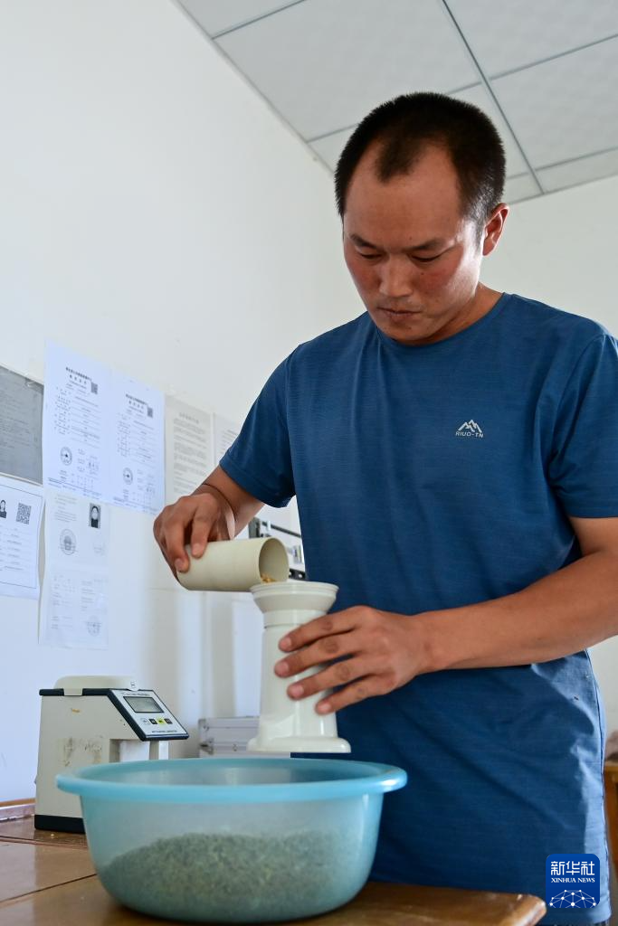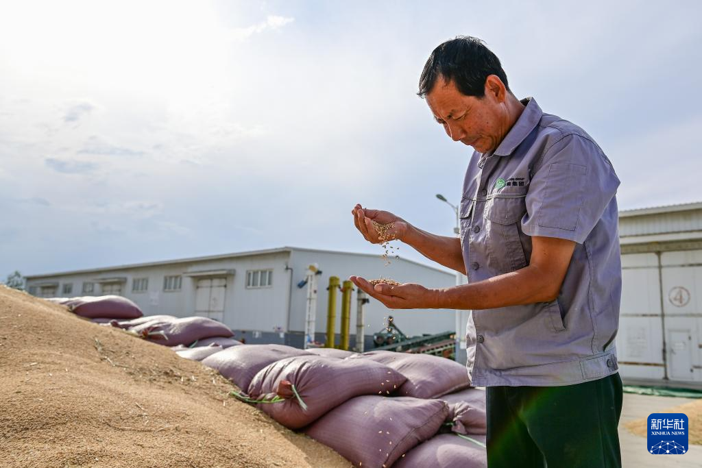 在昌粮集团奇台粮油有限责任公司中心仓库,工作人员对交售的小麦进行检测(7月9日摄)。