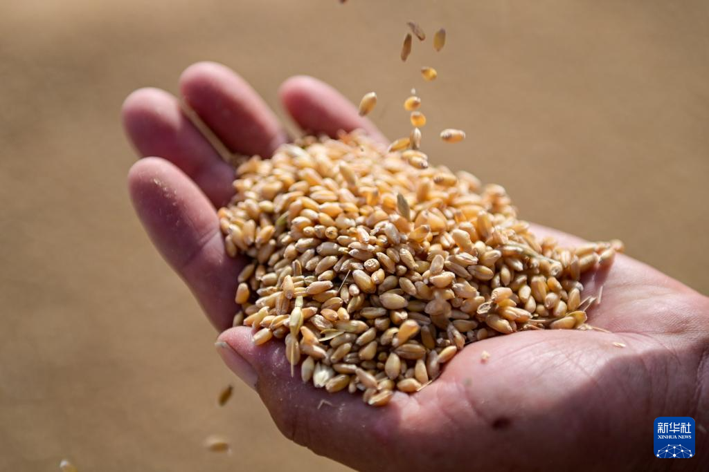 在昌粮集团奇台粮油有限责任公司中心仓库,工作人员查看收获的小麦(7月9日摄)。