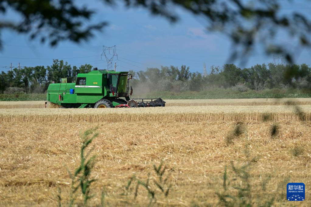 在新疆昌吉回族自治州奇台县西地镇,农户驾驶收割机在田间收获小麦(7月9日摄)。