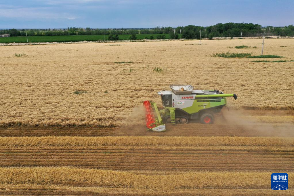 在新疆昌吉回族自治州奇台县西北湾镇,农户驾驶收割机收获小麦(7月9日摄,无人机照片)。