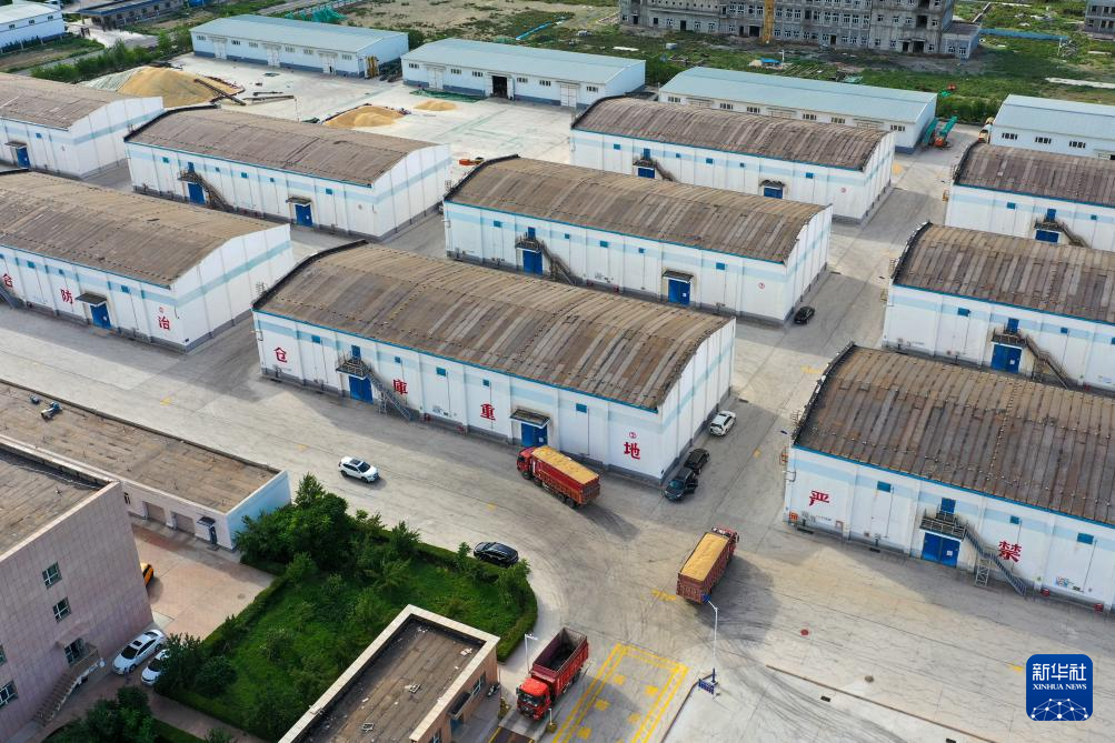 运粮车进入昌粮集团奇台粮油有限责任公司中心仓库(7月9日摄,无人机照片)。