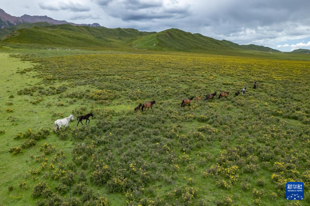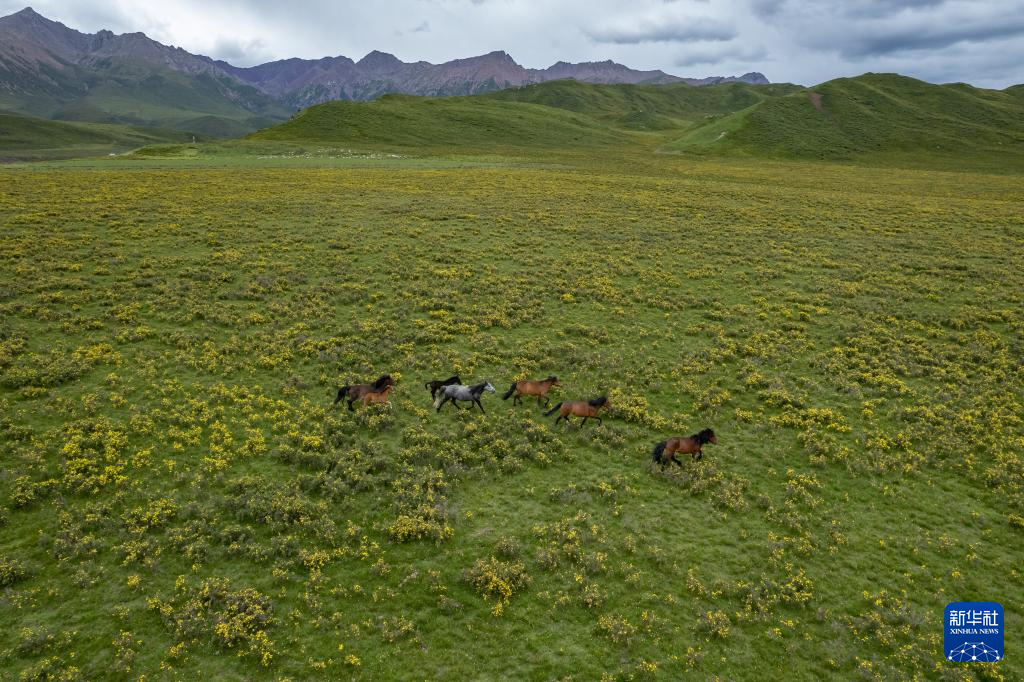 7月10日,在甘肃省张掖市肃南裕固族自治县皇城镇境内的祁连山脚下,马群在草原上奔跑(无人机照片)。