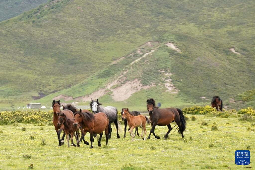 7月10日,在甘肃省张掖市肃南裕固族自治县皇城镇境内的祁连山脚下,马群在草原上奔跑。