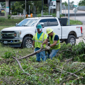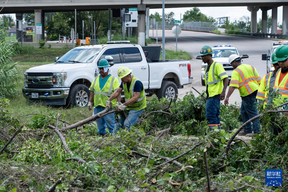 7月9日,在美国得克萨斯州休斯敦,工人清理公路上的树枝。