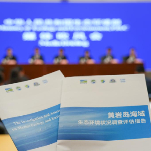 这是在北京的发布现场拍摄的《黄岩岛海域生态环境状况调查评估报告》中文版和英文版(7月10日摄)。