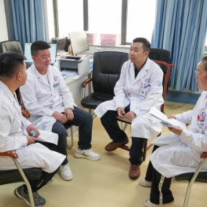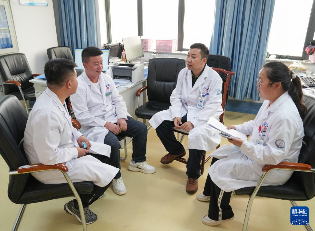 在日喀则市人民医院,胡健卫(右二)与徒弟段颖骞(左一)、张武(左二)、潘亚茹在办公室内开会(7月8日摄)。