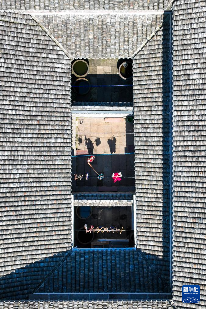 7月10日,居民在宁波慈城古县城的民居内晾晒衣物(无人机照片)。