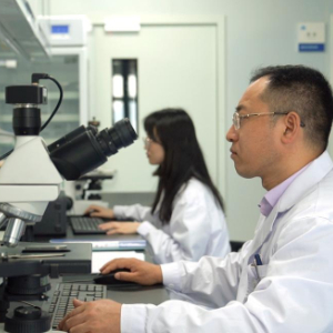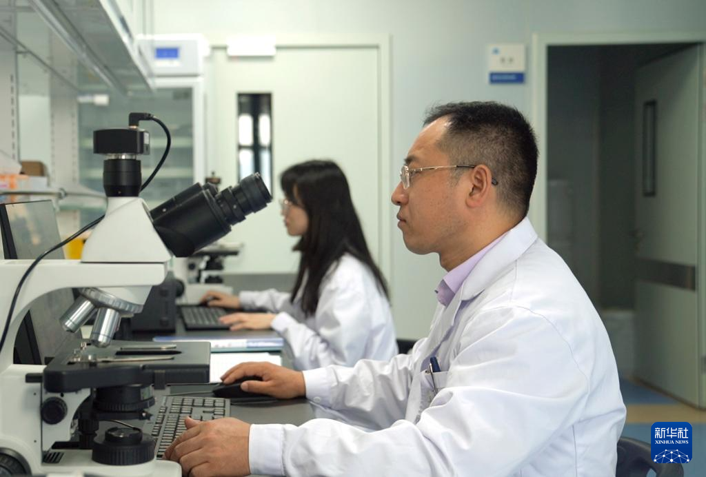 在重庆大学附属三峡医院分子病理中心实验室,印明柱(右)在鉴定患者血液循环肿瘤细胞(6月20日摄)。