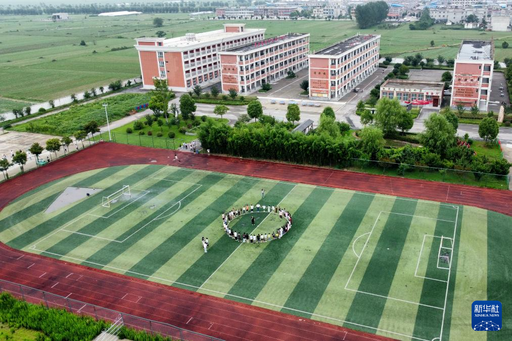 7月11日,复旦大学的志愿者带领孩子们做游戏(无人机照片)。