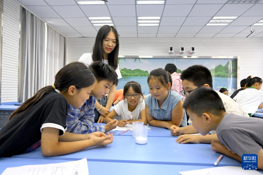 7月11日,复旦大学的志愿者带领孩子们做浮力实验。