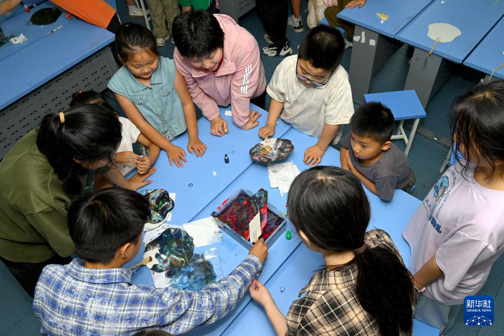 7月11日,复旦大学的志愿者带领孩子们制作手工漆扇。