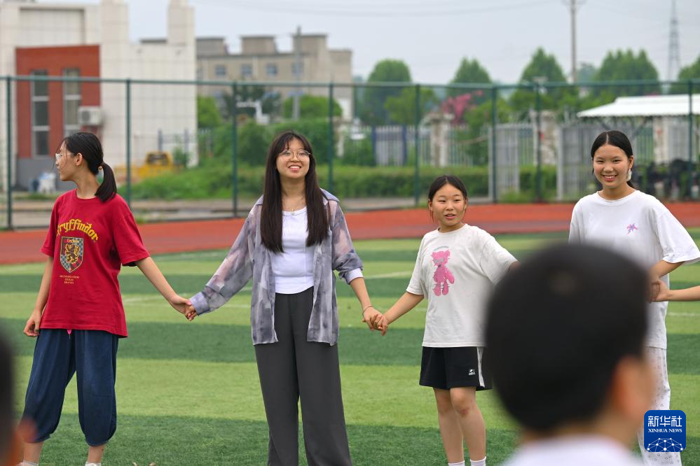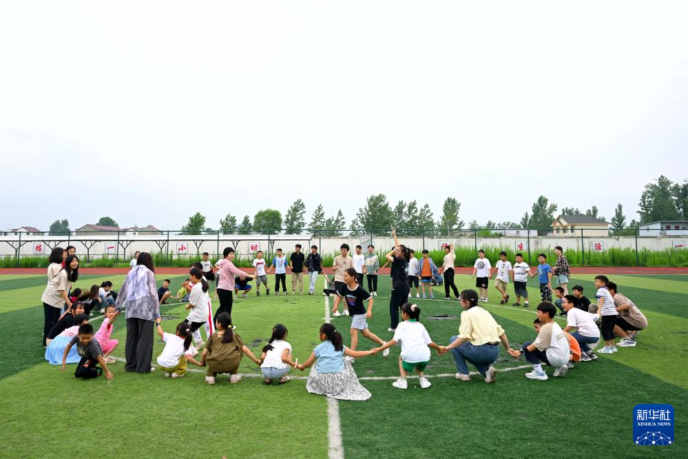 7月11日,复旦大学的志愿者(左二)带领孩子们做游戏。