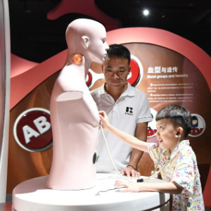7月12日,小朋友在安徽省合肥市科技馆(黄山路馆区)体验人体声音科普设备。