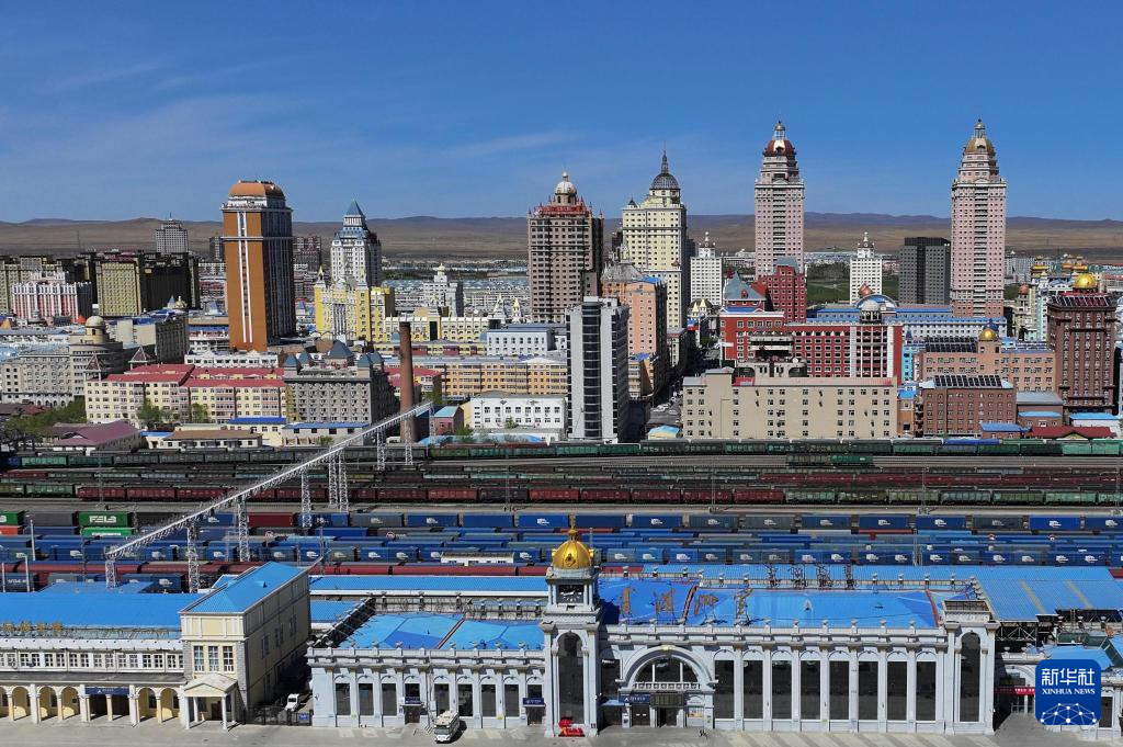 5月15日,出口中欧班列在中国铁路哈尔滨局集团有限公司满洲里站内整装待发(无人机照片)。