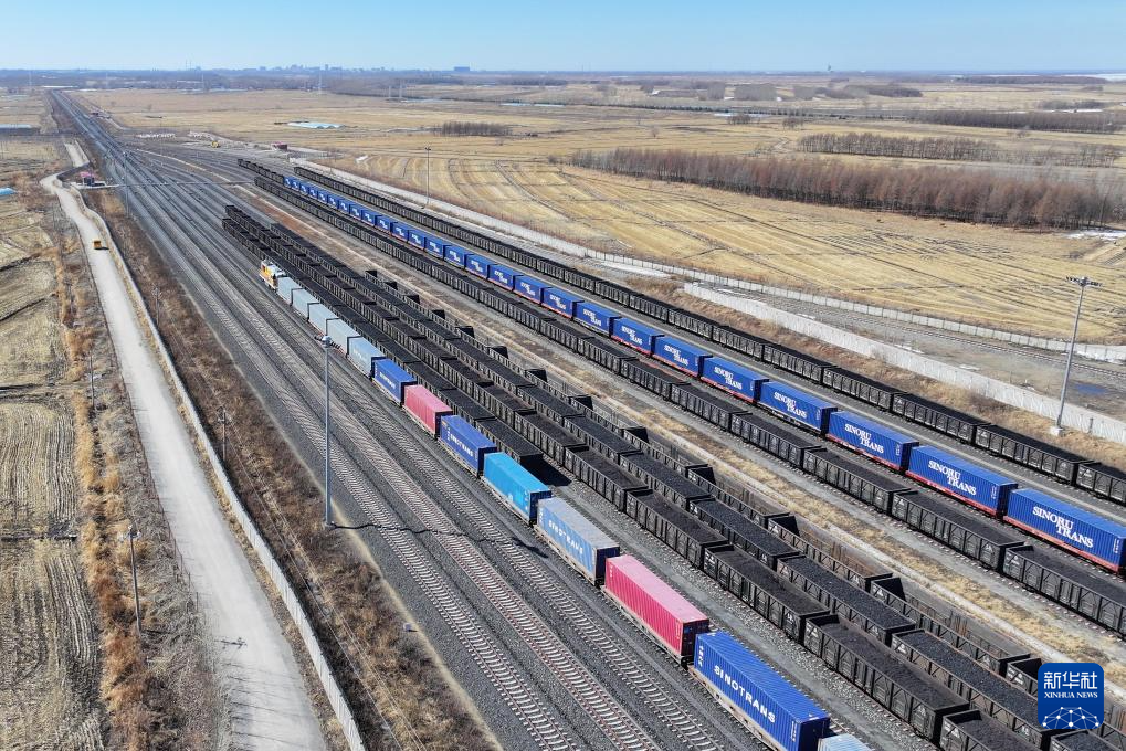 3月27日,在中国铁路哈尔滨局集团有限公司同江北站,中欧班列换装完毕准备发往国内(无人机照片)。