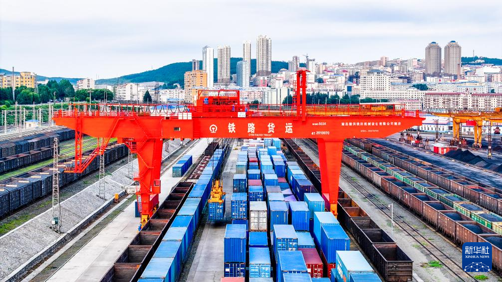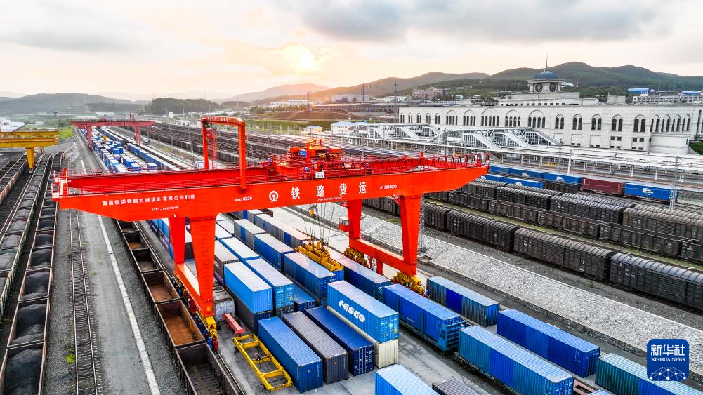 7月12日,入境中欧班列在中国铁路哈尔滨局集团有限公司绥芬河站集装箱换装场进行换装(无人机照片)。