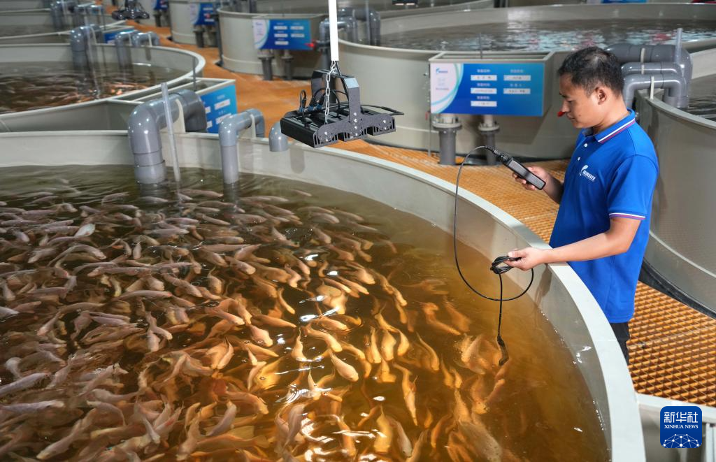7月11日,在山东省枣庄市峄城区古邵镇,工作人员在高标准鱼苗育种场内巡查并记录鱼苗生长情况。