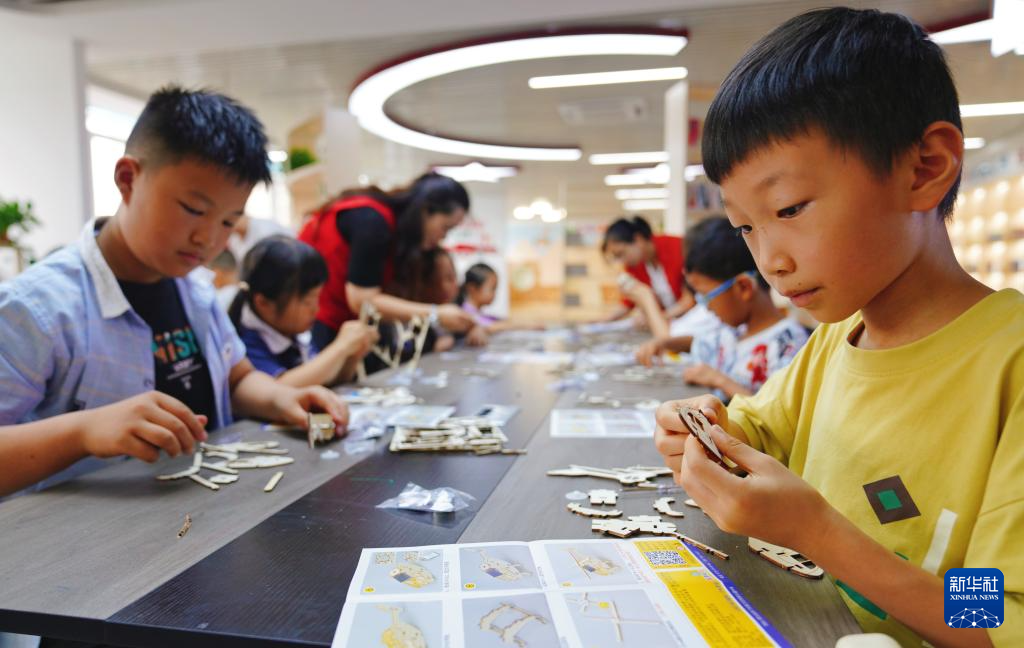 7月12日,在合肥市肥西县花岗镇董岗社区,小朋友在认真对照图纸拼接模型。
