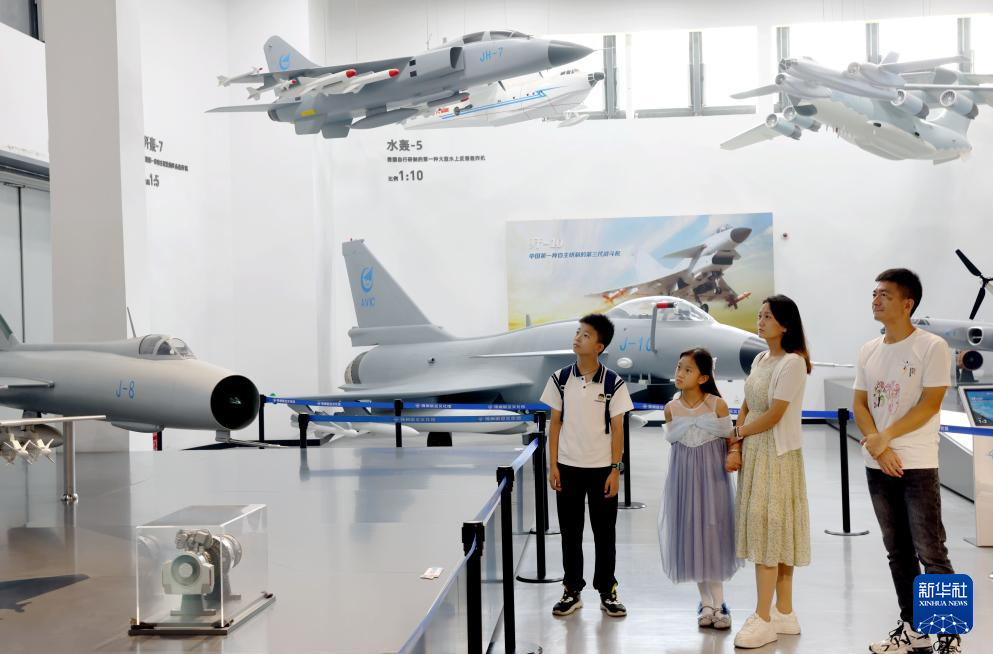 7月13日,家长带着孩子在江苏省扬州航空馆参观。