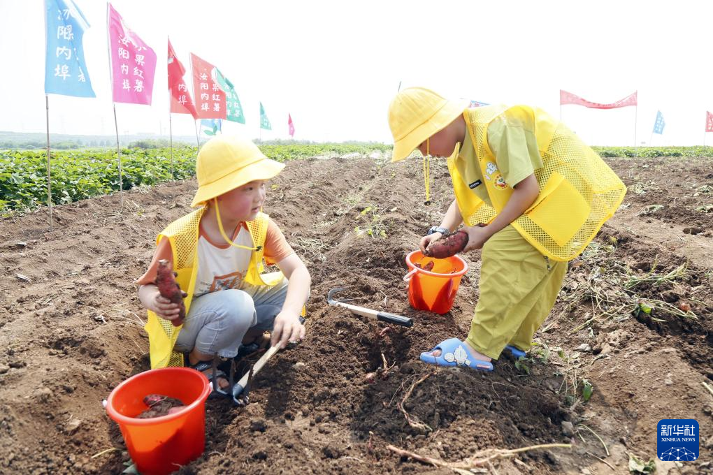 7月12日,河南省洛阳市汝阳县的小学生到内埠镇南坡村红薯地研学体验挖红薯。