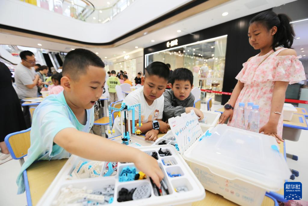 7月13日,小朋友在甘肃省定西市万达广场内进行机器人组装比赛。