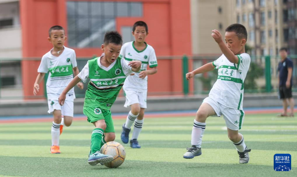 7月13日,在贵州省贵阳市开阳县第八小学,参加校园足球训练营的孩子们在球场上比赛。
